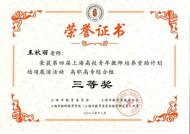 近日,2023年上海高校青年教师培养资助计划结项展演活动获奖名单出炉,我校两名老师荣获奖项。其中,经济与管理学院陆文老师获得高职高专综合组二等奖,通信与信息工程学院王秋丽老师获得高职高专综合组三等奖。