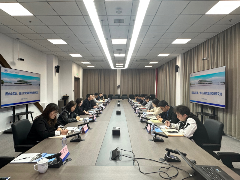 张涛对吴慧一行表示热烈欢迎,并简要介绍了我校金山校区的基本情况。希望通过此次调研,在党建带团建、社区治理、就业创业、乡村振兴等方面进一步深化校地合作,积极探索金山区大中小学思想政治教育一体化建设,形成双向赋能、双向服务、同频共振。
