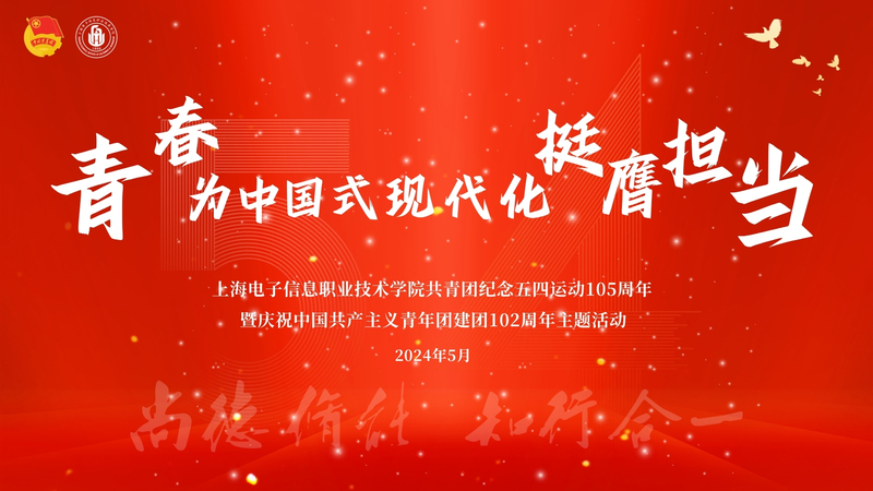 2024年是全面贯彻落实党的二十大精神的关键之年,是纪念“五四”运动105周年,中国共产主义青年团成立102周年。为进一步深入学习贯彻习近平新时代中国特色社会主义思想,弘扬五四精神,表彰先进典型,5月17日下午,“青春为中国式现代化挺膺担当”上海电子信息职业技术学院纪念五四运动105周年暨庆祝中国共产主义青年团成立102周年主题活动在中德楼C108隆重举行。