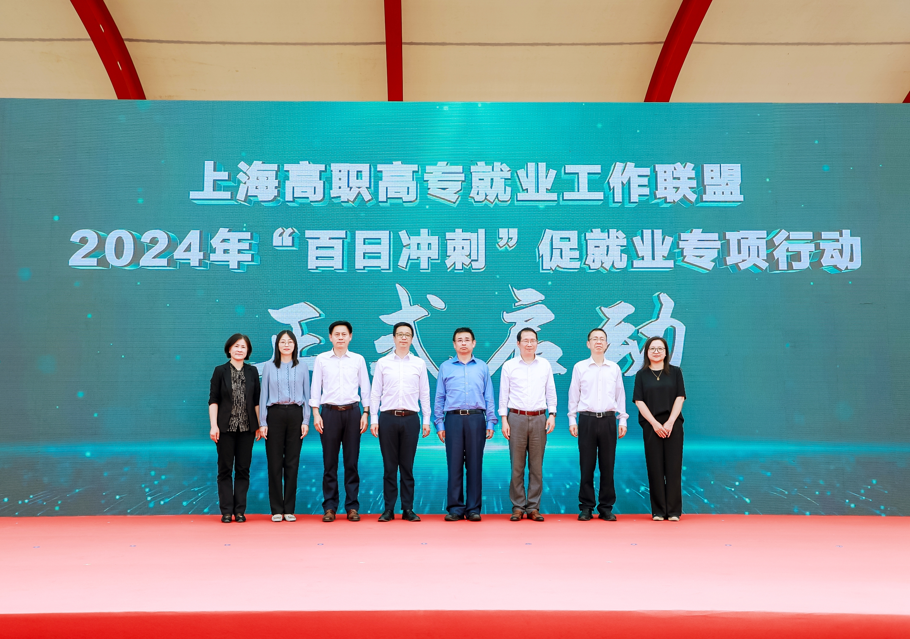 参会各单位领导共同见证上海高职高专2024年百日冲刺促就业专项行动启动仪式。