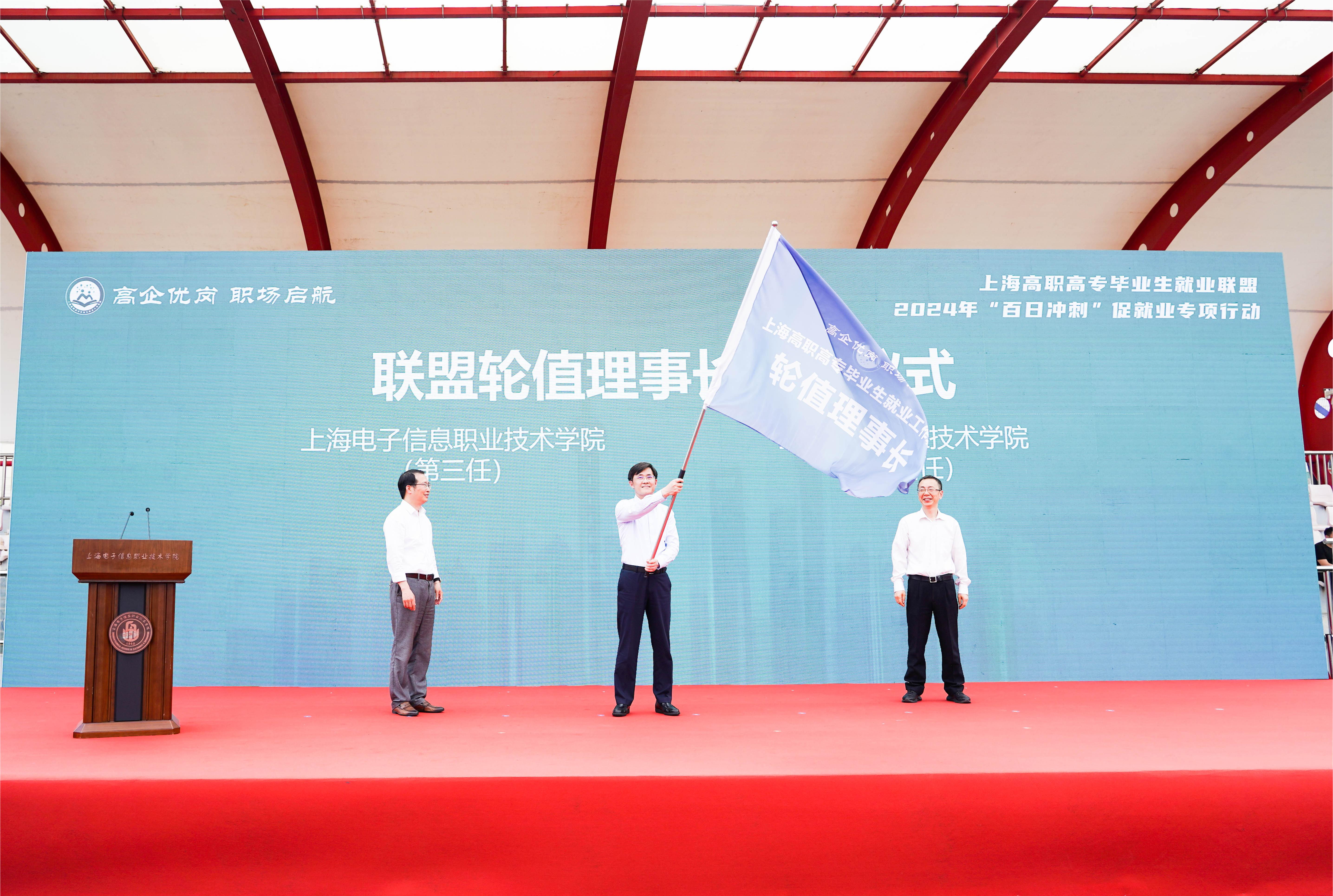 为贯彻落实党中央、国务院关于做好高校毕业生就业工作的决策部署,抢抓就业工作冲刺关键期,根据教育部关于开展2024届高校毕业生就业“百日冲刺”行动的有关要求,5月23日下午,上海高职高专院校2024年百日冲刺促就业专项行动暨第四届上海高职高专院校联合招聘会启动仪式在上海电子信息职业技术学院奉贤校区体育场举办。上海市教育委员会副主任王浩,上海市学生事务中心主任赵猛,上海市教育委员会学生处副处长周红星,上海市就业促进中心副主任赵晓云,上海市就业促进中心职介处处长王晓亮,奉贤区人力资源和社会保障局副局长王捷,奉贤区、黄浦区、松江区就业促进中心等相关领导,奉城镇镇长汤琮璀,上海工艺美术职业学院党委书记许涛,上海农林职业技术学院副院长潘国俭,上海济光职业技术学院党委副书记刘丽,我校党委书记傅建勤,党委副书记、院长赵坚,党委副书记、副院长张涛等联盟高校领导,20余所联盟高校就业中心主任参加大会。300余家用人单位来到招聘现场,并带来了8000余个就业岗位。本次招聘会在上海市教委学生处、上海市学生事务中心、上海市就业促进中心指导下,由上海电子信息职业技术学院、上海农林职业技术学院主办,上海高职高专毕业生就业工作联盟承办。大会由我校党委副书记、副院长张涛主持。