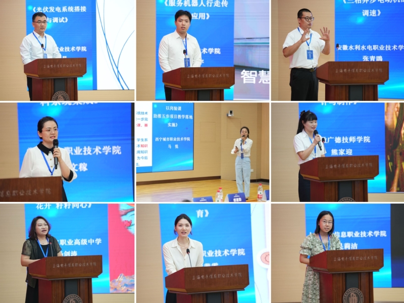 “说课程”赛项由上海电子信息职业技术学院科研处处长张迎春主持。“说课程”赛项:陕西工业职业技术学院张顺星《光伏发电系统搭接与调试》、温州职业技术学院宋吴宇《服务机器人行走传感器应用》、安徽水利水电职业技术学院张青鵾《三相异步电动机的调速》、常州机电职业技术学院许文稼《视觉引导光纤盘上料系统集成》、安徽广德技师学院熊家迎《灭虫灯的数字化设计与制作》、西宁城市职业技术学院马悦《校企协同 项自引领 以岗验课 助推五步项目教学落地实施》、玉溪第二职业高级中学杨剑涛《解决中国民族问题的根本途径——石榴花开 籽籽同心》、上海南湖职业技术学院蒋茜雯《婴幼儿音乐启蒙教育》、上海电子信息职业技术学院吴莉洁《C919动力系统数智维护》。