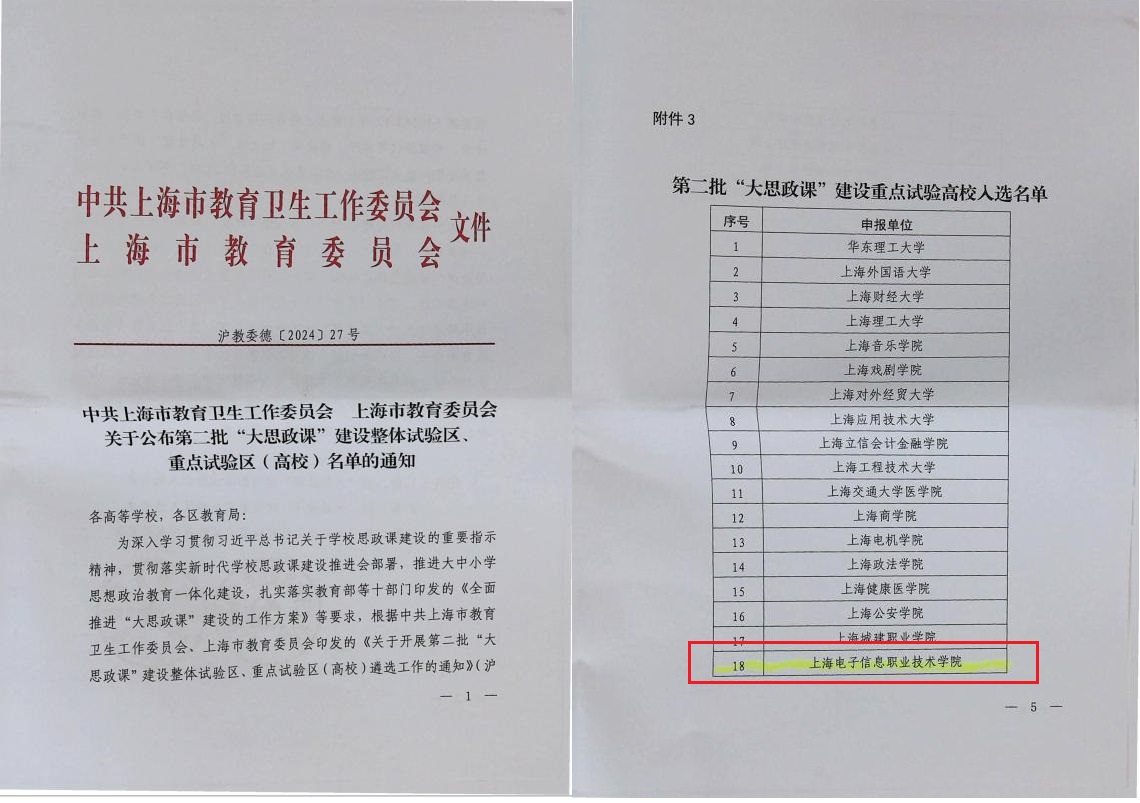 日前,上海市教育卫生工作委员会、上海市教育委员会联合发文公布了《关于第二批“大思政课”建设整体试验区、重点试验区(高校)名单》,我校成功入选第二批“大思政课”建设重点试验高校。