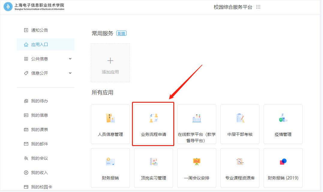 1、进入“校园综合服务平台”,点击“业务流程申请”。