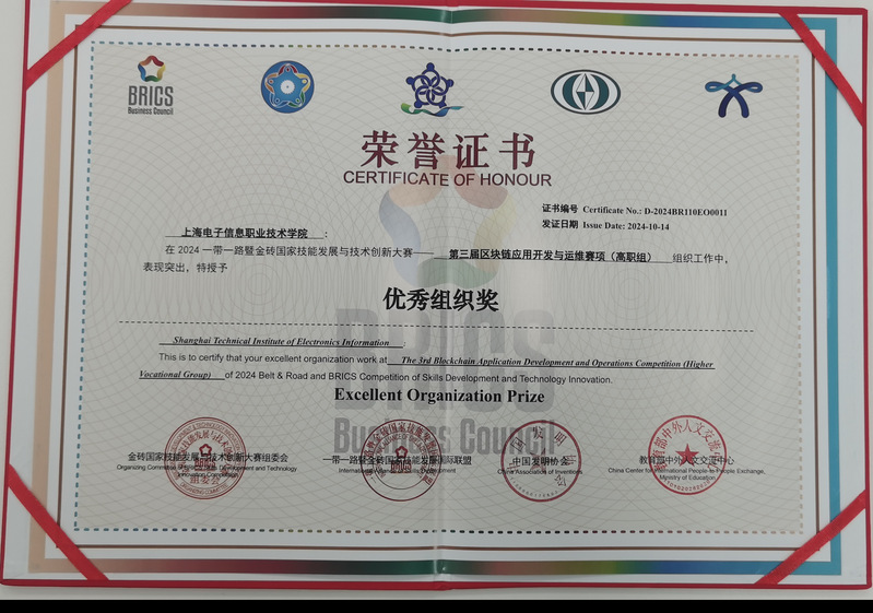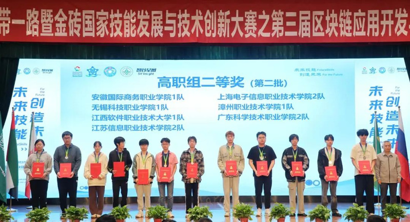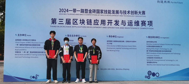 2024“一带一路”暨金砖国家技能发展与技术创新大赛之第三届区块链应用开发与运维赛项国内赛决赛于10月12日至10月14日在温州科技职业学院举办。全国9支本科参赛队、179支高职参赛队参赛,我校申安学院参赛队伍表现出色,包佳骏和李冰荣获二等奖,王心宇和连嘉浩荣获三等奖,唐坤、魏雪蕊两位老师获优秀指导老师奖,学校获优秀组织奖。