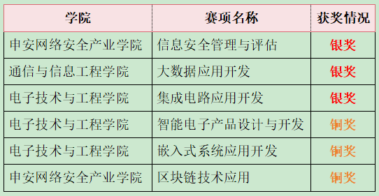 近日,备受瞩目的2024年世界职业院校技能大赛总决赛争夺赛各项目圆满落幕,我校代表队凭借卓越的专业技能与紧密的团队协作,斩获了3项银奖和3项铜奖,其中申安网络安全产业学院“信息安全管理与评估”、通信与信息工程学院“大数据应用开发”、电子技术与工程学院“集成电路应用开发”赛项获得银奖;电子技术与工程学院“智能电子产品设计与开发”“嵌入式系统应用开发”、申安网络安全产业学院“区块链技术应用”赛项获得铜奖。