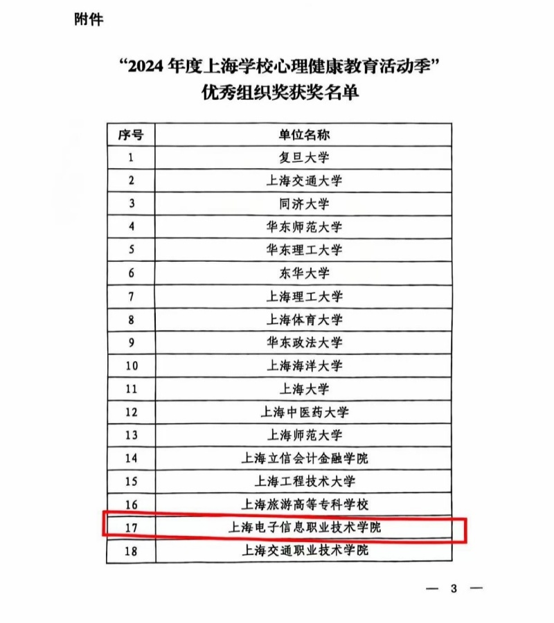 根据《上海市教育委员会关于举办2024年度上海学校心理健康教育活动季的通知》(沪教委德〔2024〕9号)要求,经上海市教委德育处、上海学生心理健康教育发展中心组织专家评审,我校“培根铸魂,为心赋能”心理健康教育季活动荣获“2024年度上海学校心理健康教育活动季优秀组织奖”。