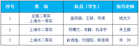 此次竞赛我校共派出了16支队伍参赛,参赛队员们来自不同专业,涵盖通信、电气、智能控制、信息安全等多个学科,其中高雨萌、王琴、符淏组成的团队荣获全国二等奖和上海市一等奖(指导老师:姚光文);郑博文、韦静、仇泽宇组成的团队荣获上海市二等奖(指导老师:朱玉辉);俞迥逸、刘熠阳、陈佳琪组成的团队荣获上海市二等奖(指导老师:朱玲)。