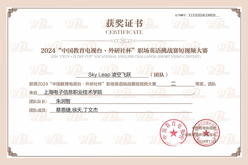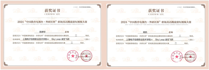 近日,2024“中国教育电视台·外研社杯”职场英语挑战赛短视频大赛决赛结果揭晓。我校外语院学院陈婷华、杨凯两位老师指导的Sky 凌空飞跃(Sky Leap)学生团队凭借出色的创意和精湛的英语表达能力,荣获全国二等奖。