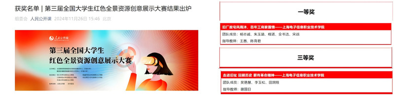 近日,由全国高校思政课虚拟仿真体验教学中心和教育部课程思政教学研究示范中心主办的第三届全国大学生红色全景资源创意展示大赛结果出炉。我校师生团队在此次大赛中表现出色,荣获一等奖和三等奖。这些成果不仅彰显了我校在红色资源展示方面的创新实力,也体现了我们在思政课实践教学改革方面的积极探索。