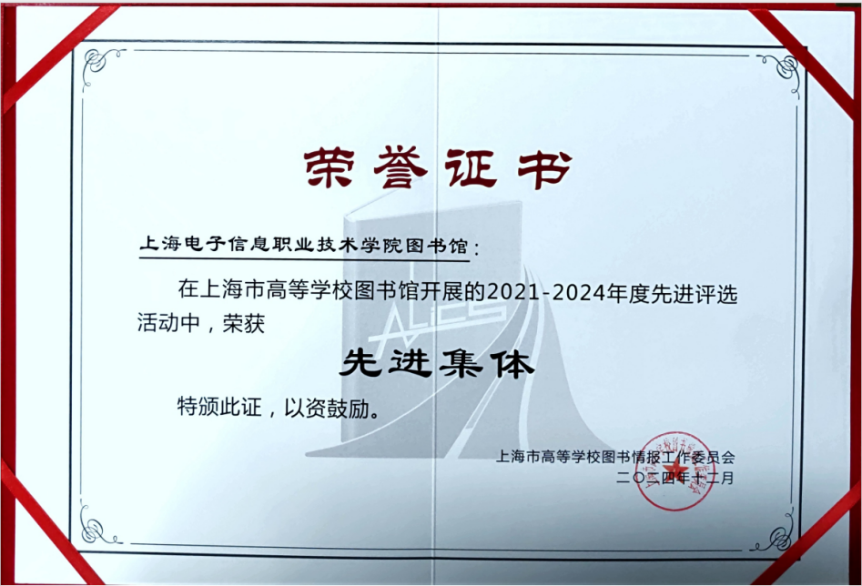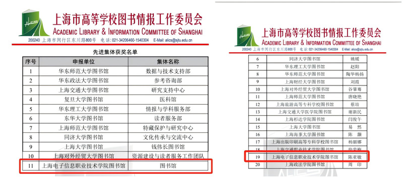 近日,上海市高等学校图书情报工作委员会常委会公布上海市高校图书馆 2021-2024 年度评选先进结果。我校图书馆荣获“先进集体”称号,成为11个获奖集体中唯一一所高职院校图书馆,这亦是我校首次荣获此项殊荣。馆员陈亚敏被评为“先进个人-服务之星”。