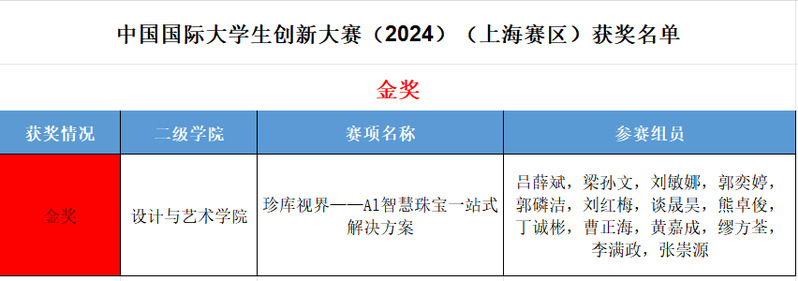 近日,上海市教育委员会公布了中国国际大学生创新大赛(2024)(上海赛区)获奖名单。我校学生团队获金奖1项、银奖10项、铜奖19项、优胜奖11项。同时,我校被评为“优秀组织单位”。