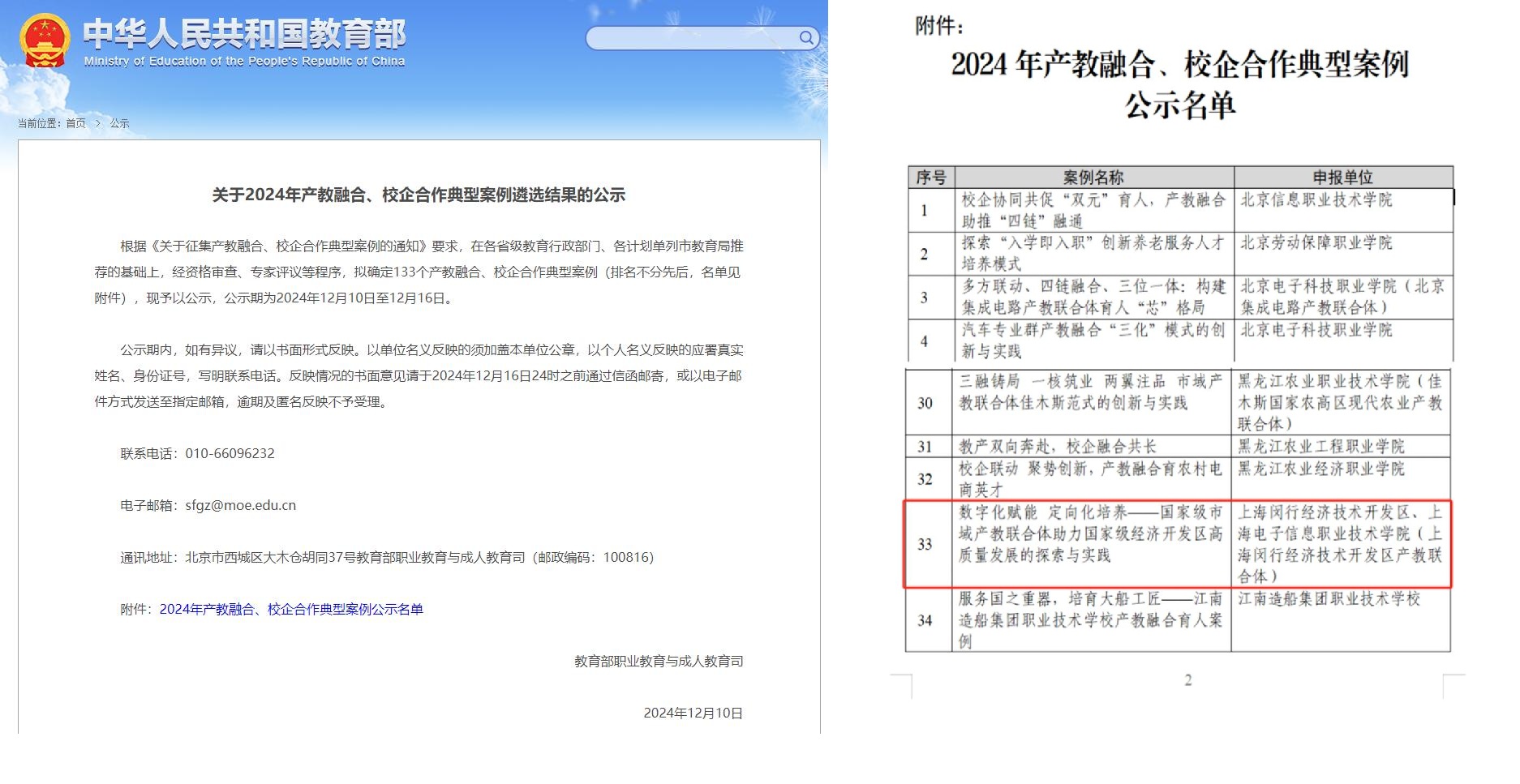 近日,教育部职业教育与成人教育司发布《关于2024年产教融合、校企合作典型案例遴选结果的公示》,我校与上海闵行经济技术开发区共同报送的市域产教联合体案例《数字化赋能定向化培养——国家级市域产教联合体助力国家级经济开发区高质量发展的探索与实践》成功入选,成为教育部此次认定的133个产教融合、校企合作典型案例之一。