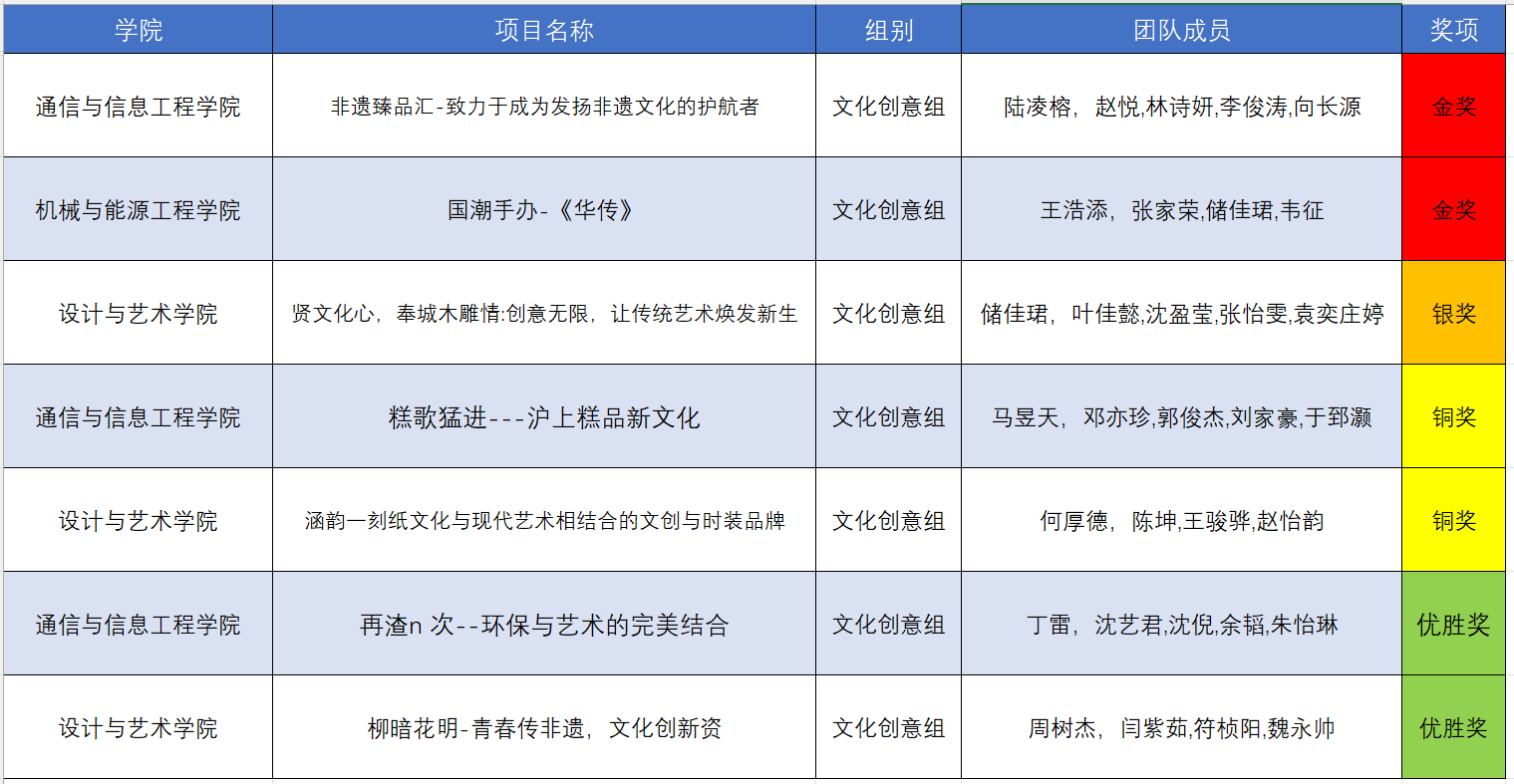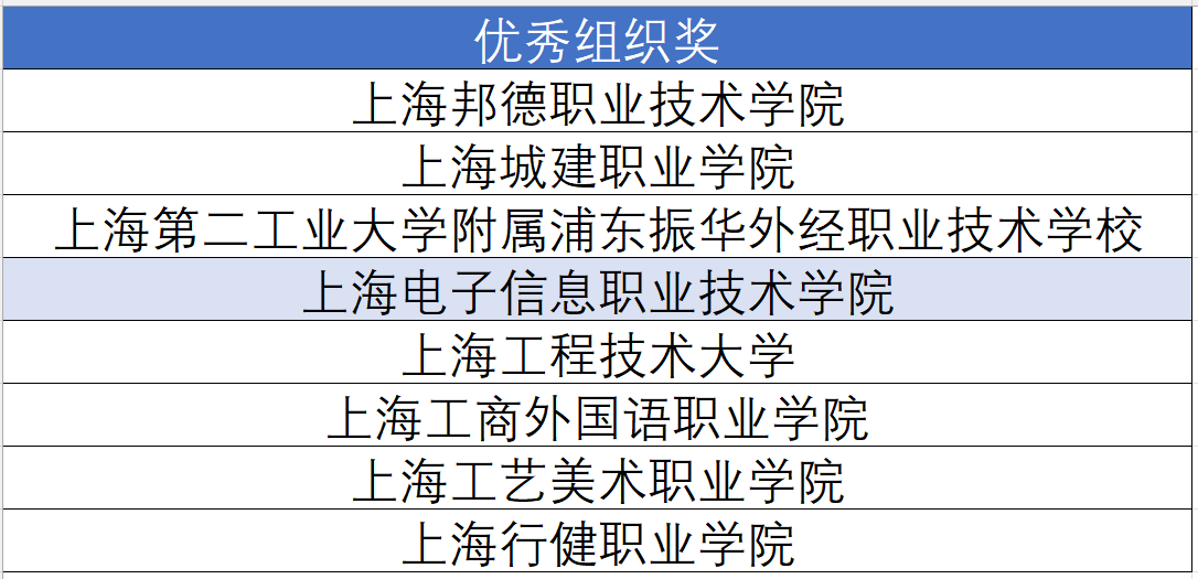 近日,第二届上海市职业院校学生创新创意大赛圆满结束。我校学生团队在本次大赛中荣获佳绩,其中科技创新组金奖2项、银奖3项、铜奖5项;文化创意组金奖2项、银奖1项、铜奖2项、优胜奖2项;8位教师获优秀指导教师奖。此外,学校荣获优秀组织奖。