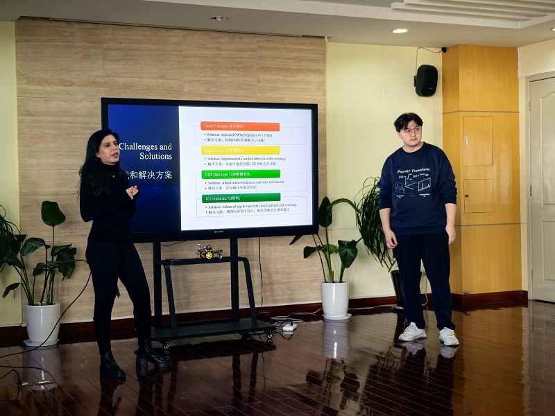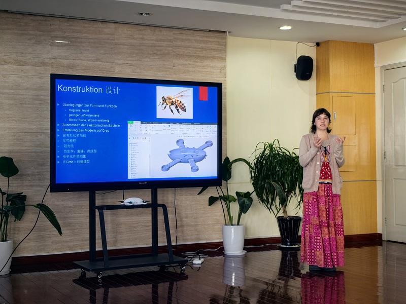 6名德国留学生从今年9月份开始,分别在电子技术与工程学院、通信与信息工程学院、经济与管理学院、中德工程学院带教教师的精心指导下进行了为期4个月的项目学习。总结仪式上,他们以小组为单位,汇报了以智能小车开发、智能时钟设计、无人机设计与3D打印、线上学习平台开发为主题的专业学习项目,展示了最终学习成果,分享了他们在华学习期间的汉语学习和文化体验。留学生们纷纷提到,他们在中国度过了一段美好而难忘的时光,通过参与中秋节活动、参观博物馆等文化活动,深入了解了中国历史和人文,结交到了很多中国朋友,更加热爱中国优秀文化,并对学校和教师们给予的大力支持与关怀帮助表示了衷心的感谢。