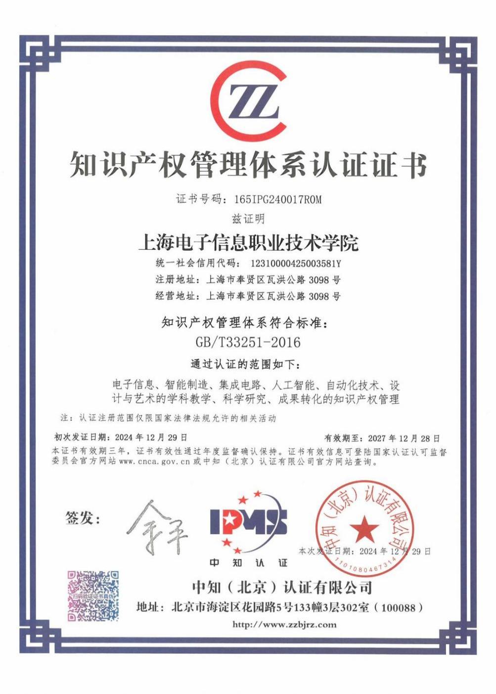 12月24日,知识产权贯标外审会议在学校召开。学校成功通过了由中知(北京)认证有限公司开展的知识产权管理体系认证首次监督审核,并被授予《知识产权管理体系认证证书》。我校成为上海市首家通过知识产权管理体系认证的高职院校。