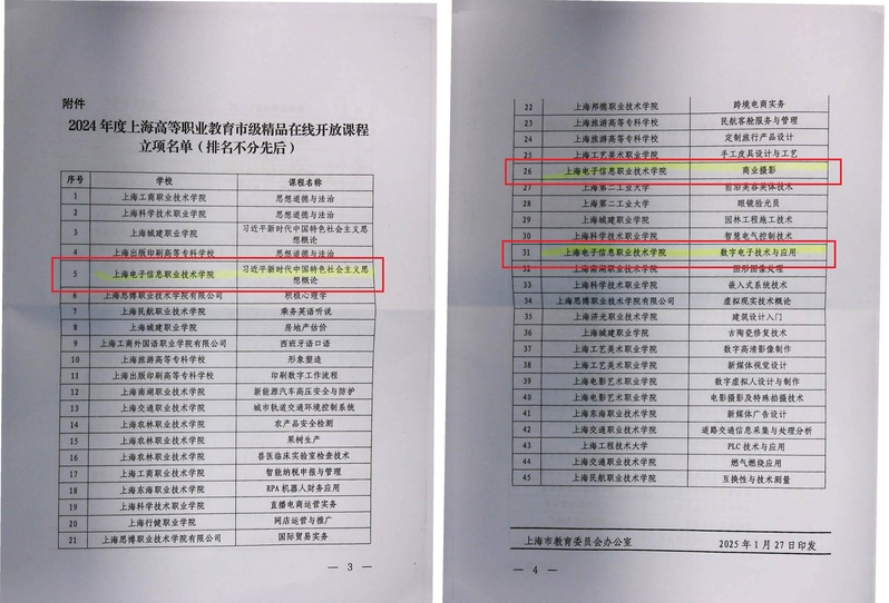 近日,上海市教育委员会公布了《2024年度上海高等职业教育市级精品在线开放课程立项名单》,经学校申报、专家评议和网上公示等程序,我校《习近平新时代中国特色社会主义思想概论》《商业摄影》和《数字电子技术与应用》等三门课程获批立项建设。