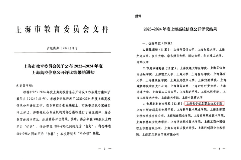近日,上海市教委发布《上海市教育委员会关于公布2023-2024年度上海高校信息公开评议结果的通知》(沪教委办〔2025〕8号),公布了2023-2024年度上海高校信息公开评议结果,学校获评优秀单位。