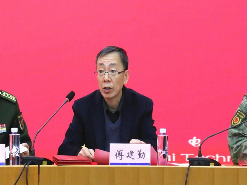 傅建勤致辞,他代表学校党委向即将步入军营的新兵们表示祝贺,向积极支持国防事业的家长致以敬意,向长期关心和支持学校征兵工作的区人武部表示感谢。他指出,同学们主动投身军营,将“小我”融入“大我”,彰显了电子信息学院学子“携笔从戎、强军有我”的时代担当。他希望同学们坚定理想信念,勇挑时代重担,在军营大舞台锻炼自我,增长才干,为学校争光,为国防贡献力量。