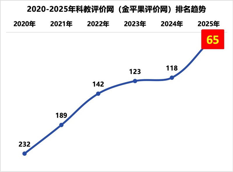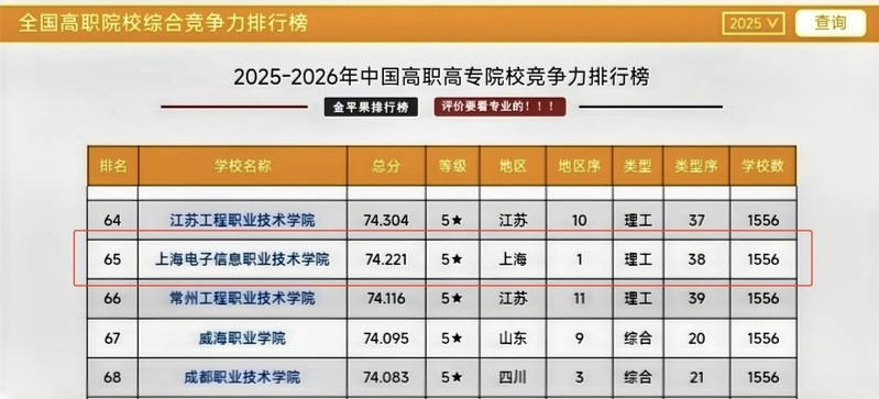 近日,2025-2026年“金平果”中国高职高专院校竞争力排行榜正式发布。学校排名从2024年全国第118位跃升至第65位,创下历史新高。这一突破性成绩标志着学校综合办学实力与社会影响力迈上新台阶。