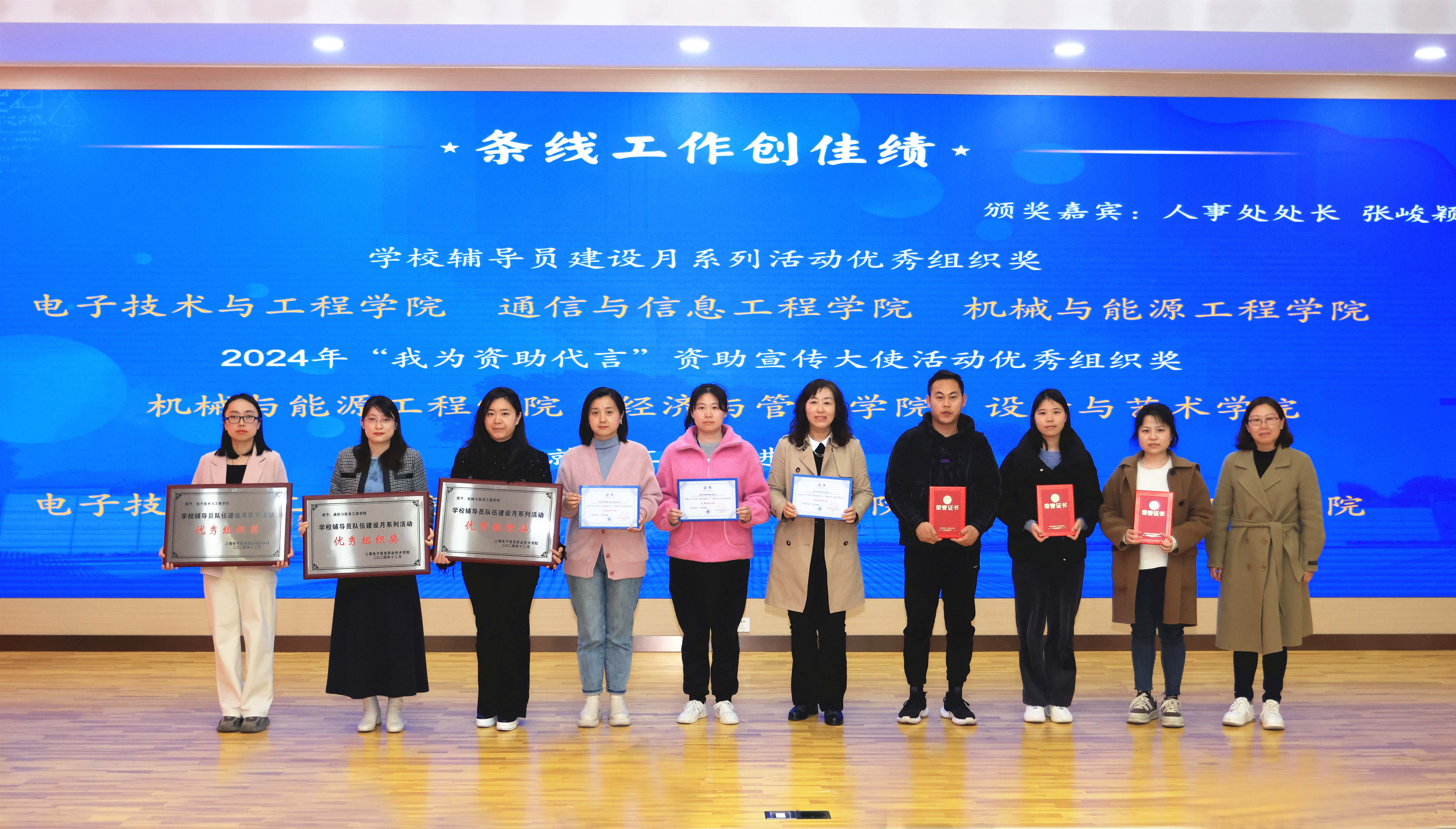 会议隆重表彰了2024年度学生工作先进集体、先进个人。学生工作部部长栾文飞宣读了《上海电子信息职业技术学院关于表彰2024年度学生工作获奖集体和个人的决定》。党委办公室主任李涛、党委组织部部长沈莉、党委宣传部部长张贯彻、人事处处长张峻颖、团委副书记何川为获奖代表颁奖。