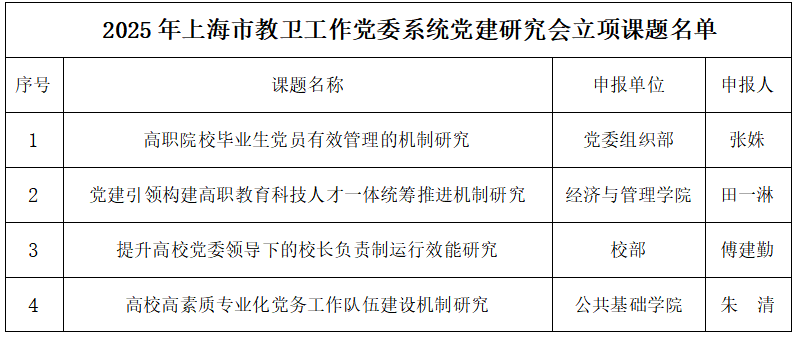 近日,上海市教卫工作党委系统党建研究会公布了2025年课题立项名单。经学院申报、专家评审、学校推荐,我校共有4项课题获立项。立项名单如下: