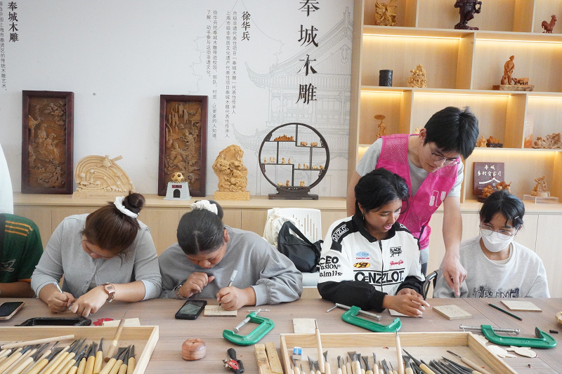 奉城木雕非遗传承人徐华兵担任现场指导教师,为留学生讲解木雕技艺的历史与艺术价值,并带领他们亲手体验雕刻过程。在徐华兵老师的指导下,木雕社团学生志愿者的协助下,留学生积极参与,尝试了传统木雕工具的使用,感受了木雕工艺的细腻与匠心。活动得到了奉城镇党群服务中心骆鸿主任的指导。