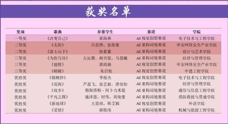 第十届校园文化艺术节“科技赋能音乐,青春礼赞时代”校园歌唱大赛圆满落下帷幕。本次大赛以声音为桥梁,融合AI技术与艺术创新,不仅为同学们提供了展示能力与创意才华的舞台,更通过AI赋能的全新演绎形式,激发同学们在科技与艺术的交汇中探索创新。未来,学校将持续以文化育人、以美育润心,激励青年学子以奋发昂扬的姿态投身时代伟业,为实现中华民族伟大复兴的中国梦凝聚无尽青春力量。(供稿:申安与网络安全产业学院团总支)