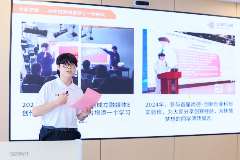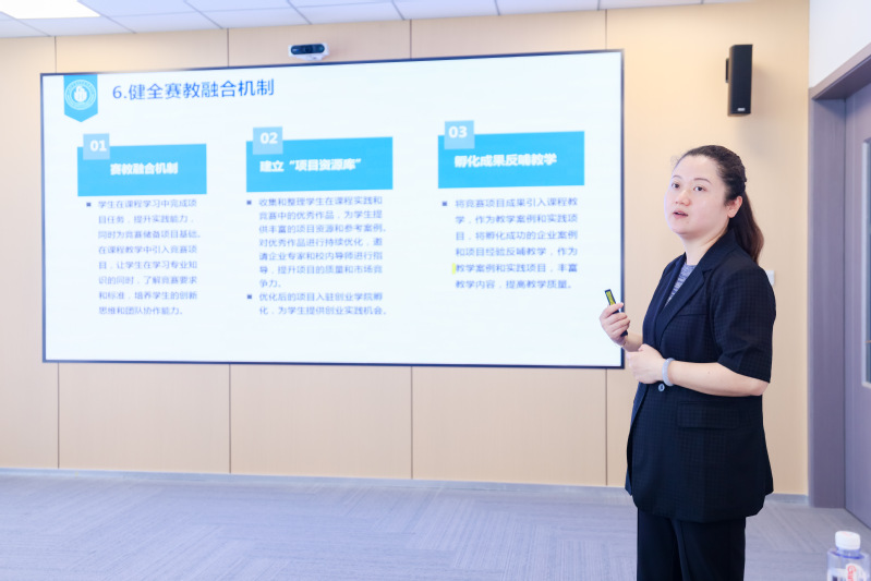 我校创新创业(世赛)学院院长蔡林洁全面系统地介绍了我校在产教融合背景下探索构建“六位一体”的创新生态教育体系、创业指导站开展情况和专创方面建设成效。我校创业学生代表来自机械与能源工程学院大三学生邹沛成和中国国际大学生创新大赛(2024)国赛铜奖、上海市级金奖的项目来自设计与艺术学院大二学生吕薛斌、梁孙文现场分享了从竞赛到参加“马兰花计划”IYB、SYB培训班、学校科创实验班、大学生创新创业训练营,再到在智能硬件开发、文化创意等领域的创业实践和成长经历。专家组施强、密波峰就我校双创教育学生实践项目市场化路径提出建设性意见,现场互动气氛热烈。