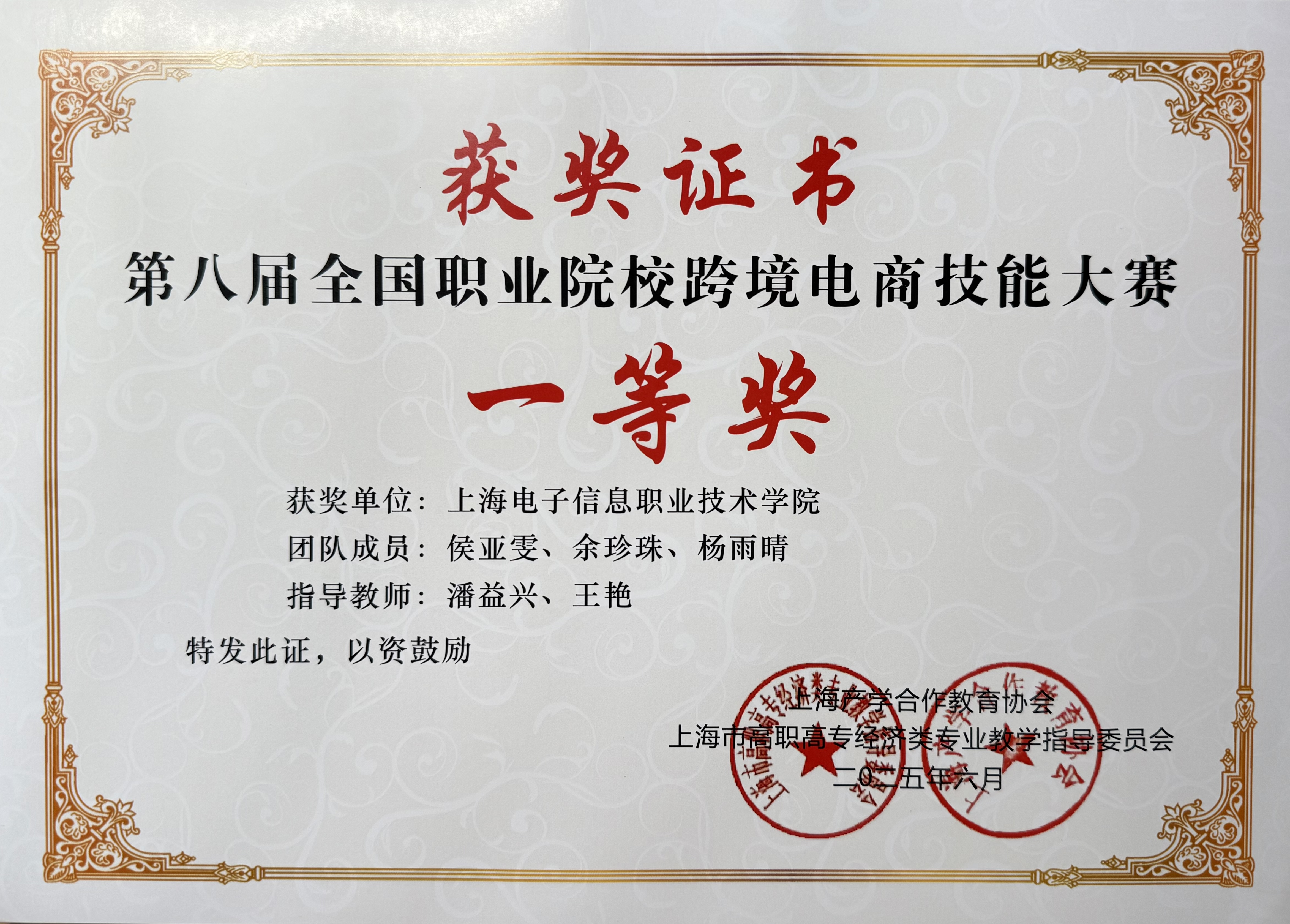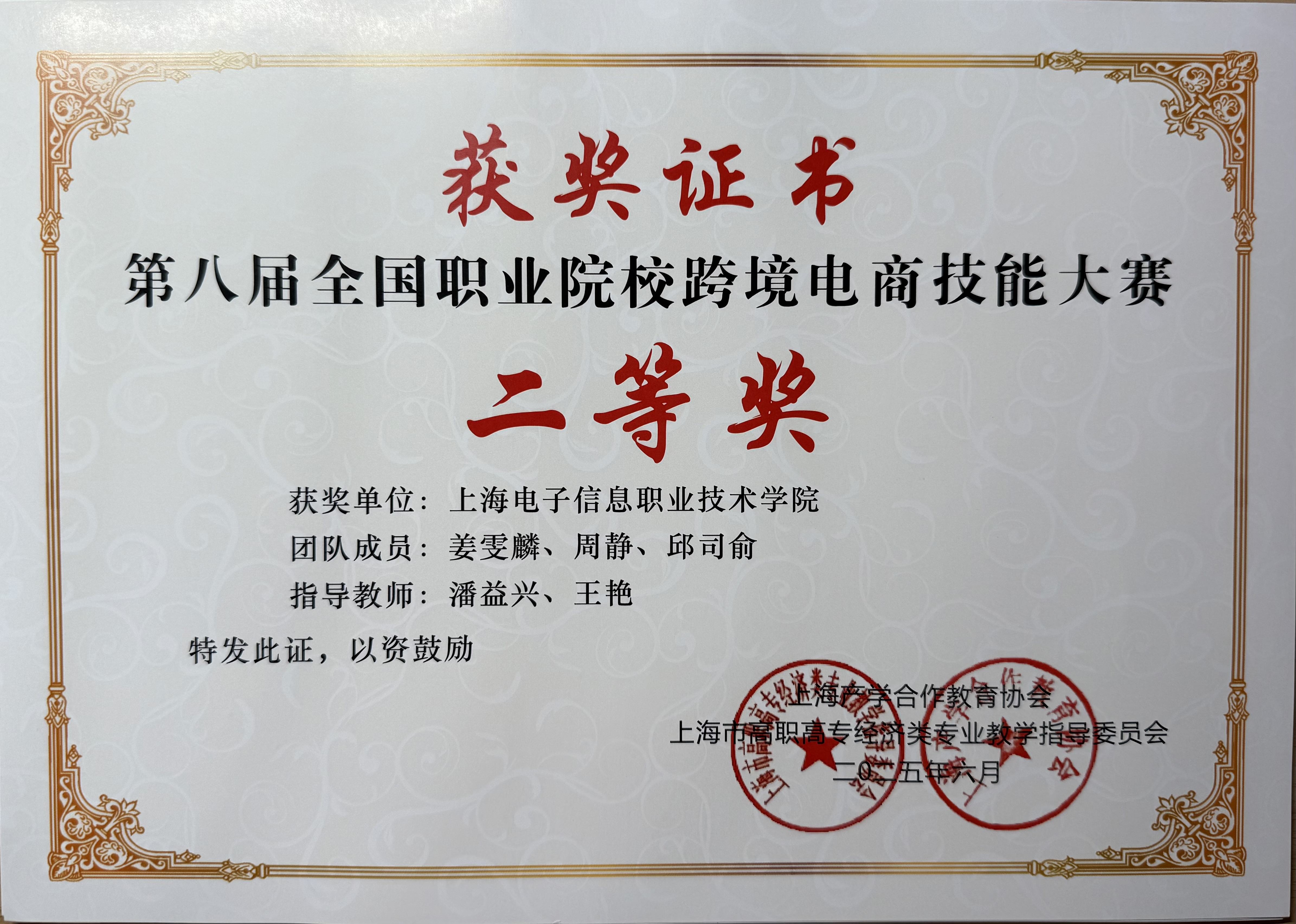 本届大赛由上海市高职高专经济类专业教学指导委员会、上海产学合作教育协会联合主办,旨在提升职业院校学生跨境电商专业技能,深化产教融合,服务国家“丝路电商”发展战略。赛事吸引了全国29个省市、202所学校共6424名学生报名参与,众多职业院校及应用型本科高校的优秀学子同台竞技,竞争激烈。经过初赛的严格筛选和决赛的激烈角逐,由杨雨晴、侯亚雯、余珍珠同学组成的团队凭借在跨境电商平台运营、选品推广、物流供应链管理等环节的优异表现,勇夺一等奖。由姜雯麟、周丹、邱司俞同学组成的团队同样发挥出色,荣获二等奖。他们的优异表现展现了我校学子精湛的职业技能和昂扬的精神风貌。