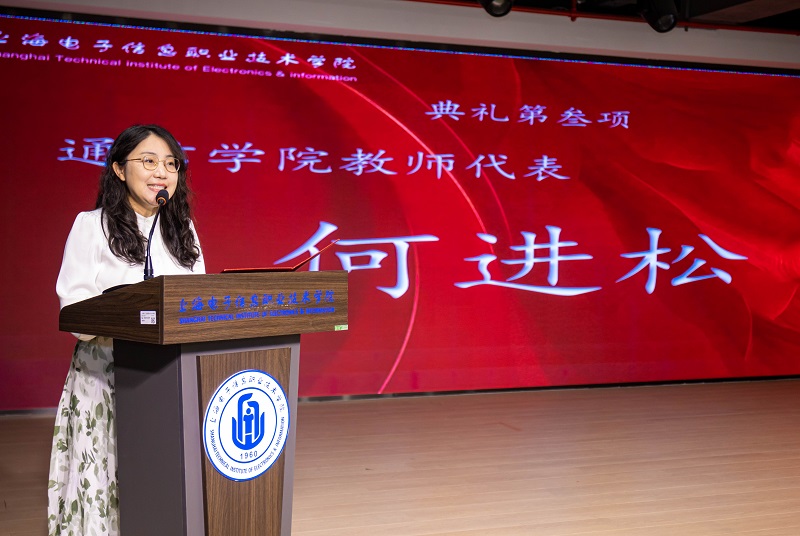 何进松作为专任教师代表发言。她向毕业生表示热烈祝贺,并从任课教师视角回顾了同学们三年来从青涩到成熟的成长历程,并用“终身学习者”“工匠精神”“拥抱生活,肩扛责任”三组关键词为学生送上祝福与期许,希望同学们在专业领域闯出成就,谱写幸福美满的人生之路,做自己人生的掌舵者。