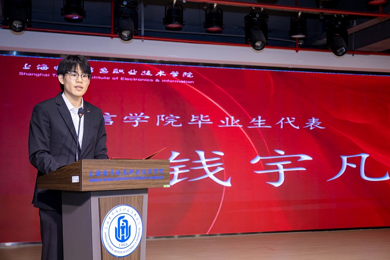 钱宇凡作为毕业生代表发言。他深情回顾了大学三年的校园生活,感谢老师们的辛勤付出,分享了自己在学生社团、技能竞赛、顶岗实习等活动中的成长与收获。他表示,同学们必将牢记母校教诲,勇敢踏上新征程,努力成为社会有用之才。最后,他向同学、母校及老师们分别送上美好祝愿。