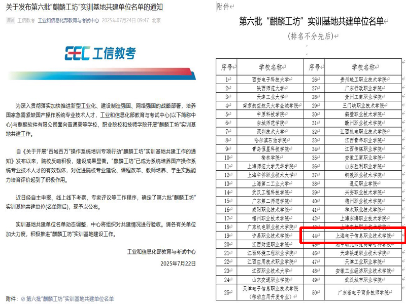 近日,由工业和信息化部教育与考试中心联合麒麟软件有限公司共同组织的第六批“麒麟工坊”实训基地共建单位名单正式公布。我校成功入选,成为国家级信创产教融合平台的共建院校之一。