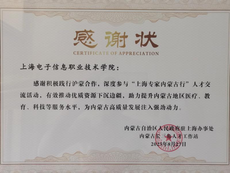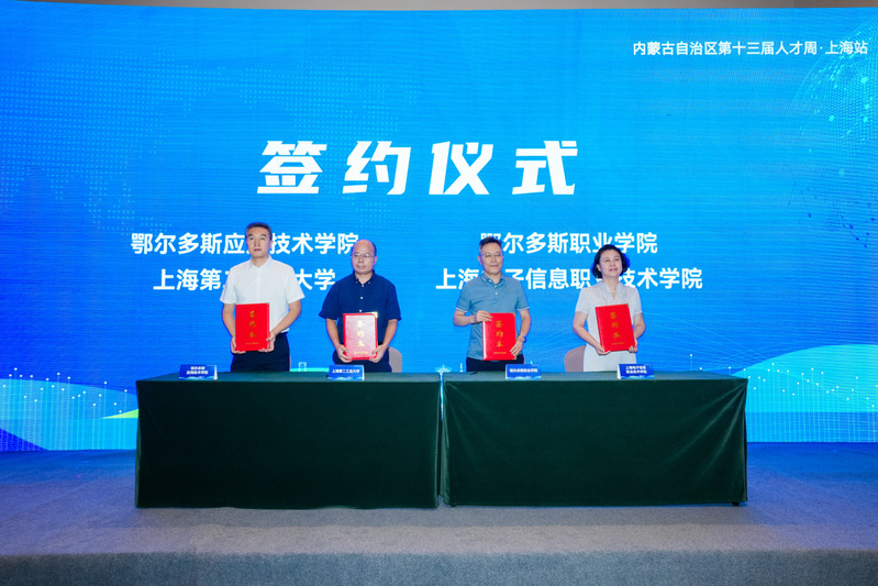 会上,窦争妍代表学校与鄂尔多斯职业学院签订了合作协议。内蒙古自治区人民政府驻上海办事处、内蒙古长三角人才工作站联合为我校颁发了感谢状,对我校在前期参与“上海专家内蒙古行”人才交流活动,助力提升内蒙古地区职业教育水平,为内蒙古高质量发展注入强劲动力表示感谢。