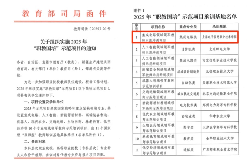 近期,我校成功获批2025年“职教国培”示范项目。学校申报的“集成电路领域领军教师示范培训项目”在140余家单位中脱颖而出,经专家打分评审,最终成为11个入选项目之一,也是唯一入选的集成电路领域项目。