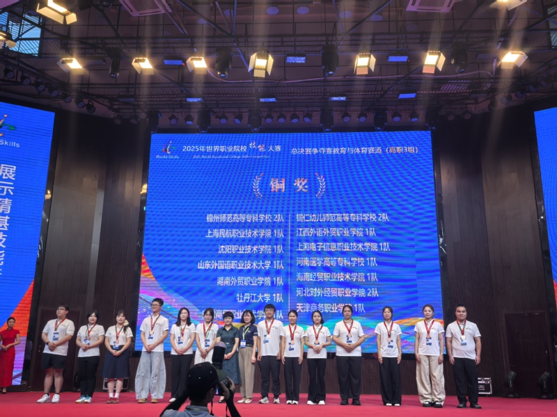 8月31日,2025年世界职业院校技能大赛总决赛争夺赛“教育与体育”赛道在长沙民政职业技术学院圆满落幕,该赛道共吸引全国28个省(自治区、直辖市)141 所职业院校的 169 支队伍 1200余师生参赛。我校外语学院英灿、郑雨欣、郭浩、江雨盈四位同学和肖潇、夏洋洋两位指导教师组成的参赛团队,经过三天激烈角逐,凭借扎实的专业素养、高效的团队协作和稳定的临场发挥,在教育与体育赛道高职 3 组的激烈竞争中脱颖而出,喜获铜奖。