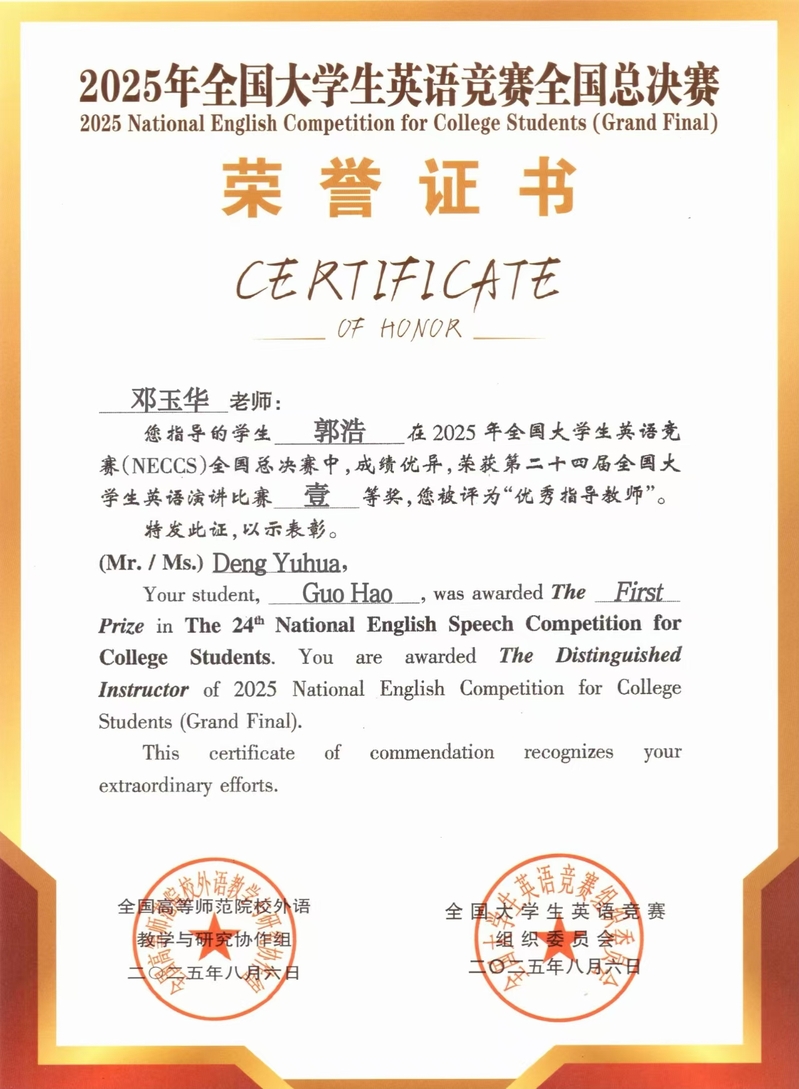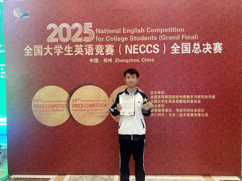 近日,2025年全国大学生英语竞赛(NECCS)全国总决赛在河南郑州举行。全国共有来自30个省、自治区、直辖市的194所高校共计323名选手参加了本次总决赛。经过激烈角逐,我校郭浩同学荣获全国大学生英语演讲比赛一等奖、入选全国大学生英语夏令营主持人、全国大学生英语夏令营优秀学员,指导老师邓玉华荣获“优秀指导教师”。