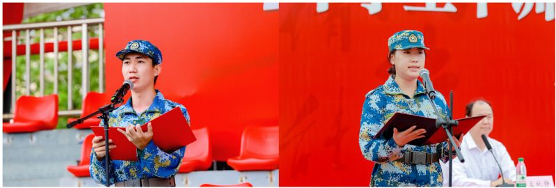 通信与信息工程学院王万翀和经济与管理学院杨舒文代表2025年参训学生发言,他们分享了军训的成长与收获,表达了对教官和老师的感激之情。他们表示,将军训的纪律与坚韧转化为专业学习的动力,用青春誓言诠释新时代青年的责任与担当。