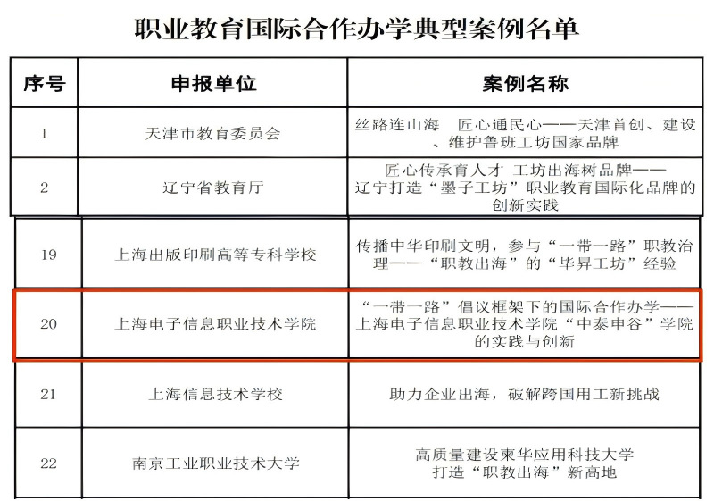 近日,中国教育国际交流协会受教育部职业教育与成人教育司委托,公布了职业教育国际合作办学典型案例名单。此次遴选共产生61个优秀案例,我校《“一带一路”倡议框架下的国际合作办学——上海电子信息职业技术学院“中泰申谷”学院的实践与创新》案例成功入选。