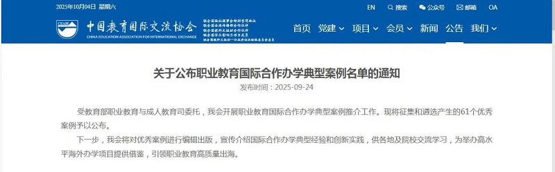 此次成功入选全国典型案例,不仅是对我校过往国际合作办学成效的认可与肯定,更为学校未来的国际化发展注入了强劲动力。展望未来,我校将以此次入选为全新起点,积极对标其他优秀案例的先进经验,持续深化国际合作办学模式的创新实践,着力提升“职教出海”的品质内涵与国际影响力,为助力我国职业教育高水平“走出去”贡献新的更大力量。(供稿:校办(国交中心))