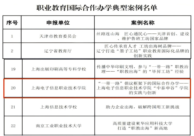 近日,中国教育国际交流协会受教育部职业教育与成人教育司委托,公布了职业教育国际合作办学典型案例名单。此次遴选共产生61个优秀案例,我校《“一带一路”框架倡议下的国际合作办学——上海电子信息职业技术学院“中泰申谷”学院的实践与创新》案例成功入选。
