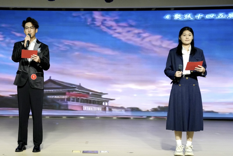 教务处副处长王西贝、学生处易班发展中心主任杨洋、公共基础学院办公室主任常浠婧担任评委。大赛紧扣“时代新声、妙解其意、青春同行”三大主题,设置“播报、讲解、互动”三大篇章,通过“我是主持人、妙语连珠”两个环节,系统测评选手的时政素养、语言功力与现场驾驭能力。赛题内容覆盖时事政治、政策解读、军事科技、体育赛事、游戏主播、纪实纪录、相声、直播、综艺晚会九大主持场景。各二级学院的参赛选手充分彰显了青年学子朝气蓬勃、富有活力的青春风采,赢得了阵阵掌声。知识竞答环节,观众们争相竞答。赵咏、蔡承轩分别演唱《我的未来不是梦》《星辰大海》,与决赛主题遥相呼应,再次点燃了现场的氛围。