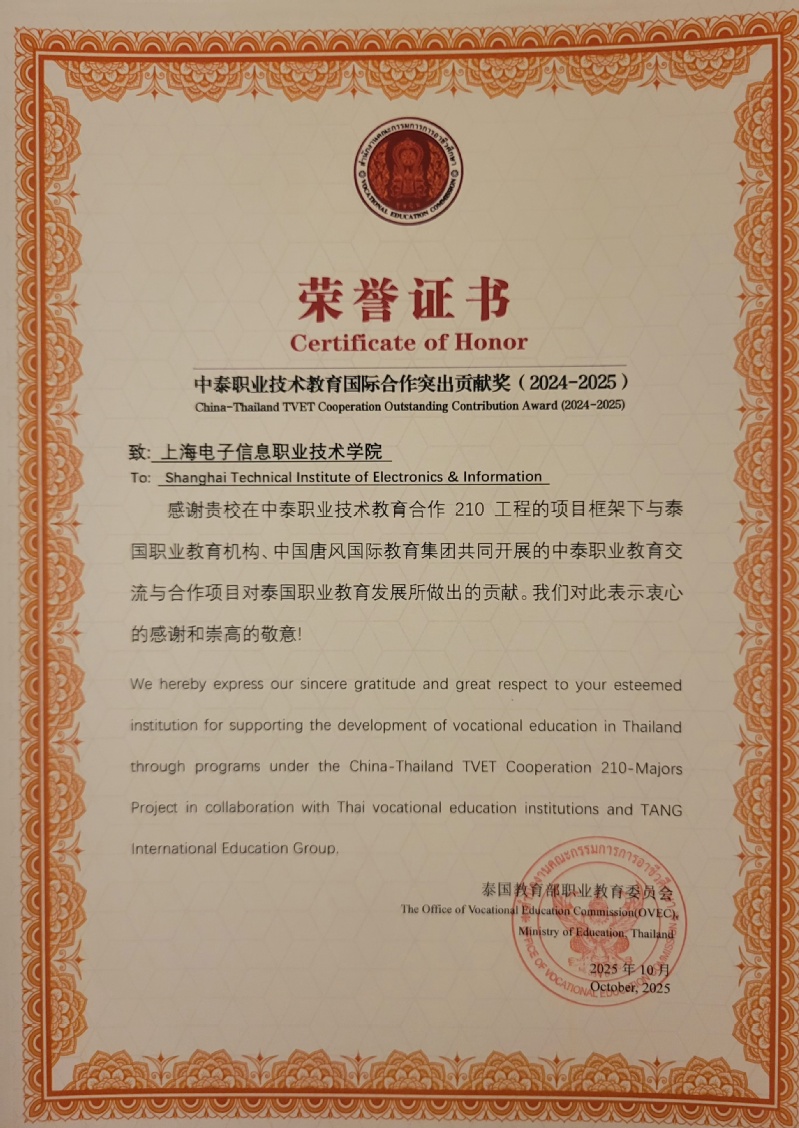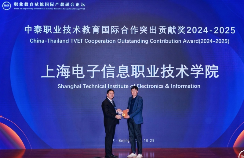 10月29日,在国家会议中心(北京)举行的第26届中国国际教育年会之职业教育赋能国际产教融合分论坛上,我校荣获由泰国教育部职业教育委员会颁发的“中泰职业技术教育国际合作突出贡献奖(2024-2025)”。这是学院自2019年中泰申谷学院成立以来,连续多年获此殊荣。