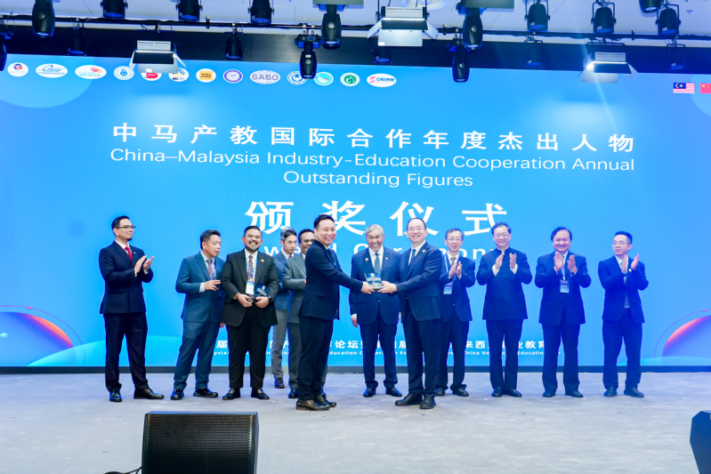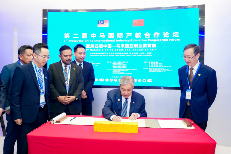在扎希德副总理的见证下,傅建勤代表学校,与其他与会嘉宾共同发起多项合作成果。其中包括,中马产业人才培养与就业项目(ITTP)、“技能照亮前程(中马)计划”、中马“人工智能+数字安全”产教融合共同体、国际职业技术技能资格认证中心合作授权仪式等,全方位夯实了两国产教协同基础。同时,学校与马来西亚多所职业院校签署国际学院合作项目,合作领域覆盖工业机器人、集成电路等我校优势专业。活动现场,我校还因长期深耕中马教育合作取得的突出贡献,荣获“中马教育国际合作卓越贡献奖”,这一荣誉也是对学校国际合作成果的又一认可。