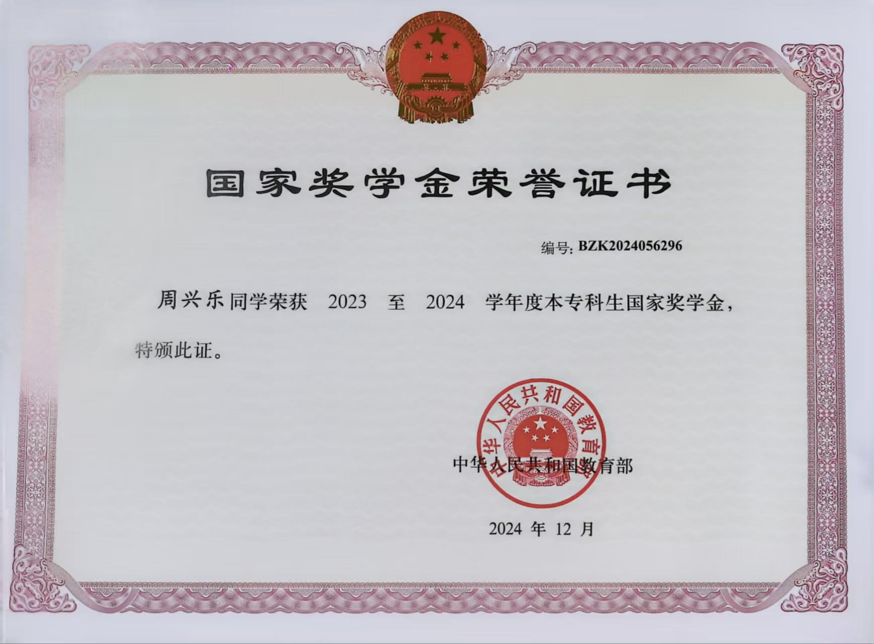作为班级班长,周兴乐同学学习勤奋,乐于钻研,在过去的两年中专业排名与综合测评排名均位列专业第一,获得2023-2024学年国家奖学金和学校综合一等奖学金。课余之时,他带领同学们开展“班级辩论”“朗诵比赛”“集体生日”“拔河比赛”等二十余场班级活动。同时,他还重视宣传工作,通过院级、个人账号报道班级事迹十余篇,已累计浏览量超一千余次,所带领班级获评2022-2023学年文明班级称号。