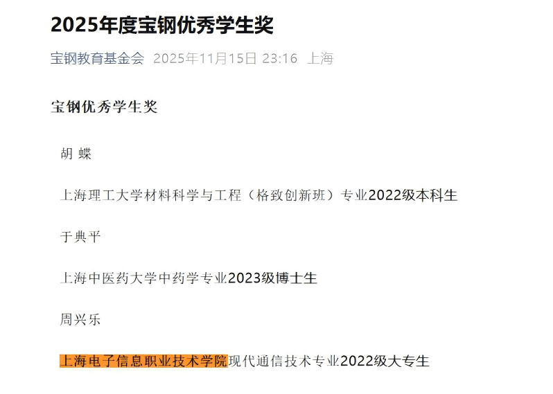 近日,2025年度宝钢教育奖颁奖仪式在上海举行,宝钢教育奖评审结果揭晓,我校通信与信息工程学院2022级现代通信技术专业周兴乐同学荣获“2025年度宝钢优秀学生奖”。