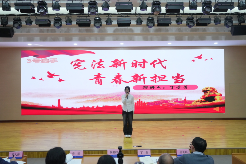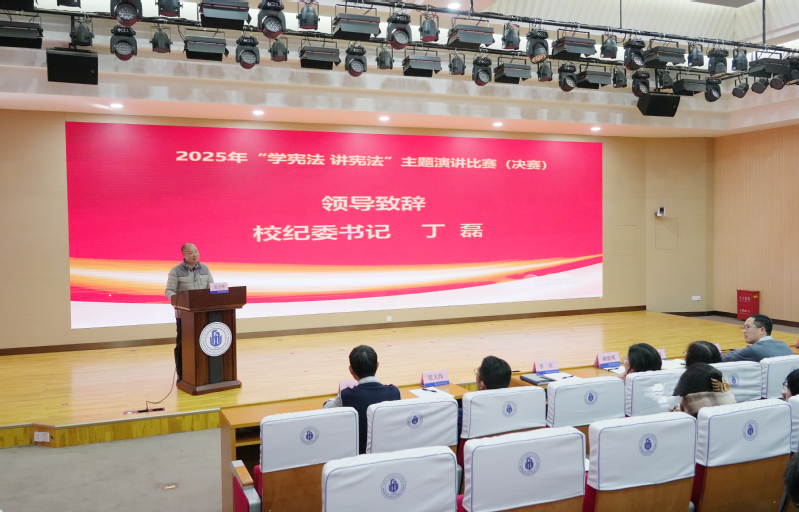 决赛现场,校党委副书记、纪委书记丁磊致辞。他寄语全体青年学子,要珍惜青春韶华,将宪法学习作为成长成才的“必修课”,深刻领会宪法确立的国家指导思想,坚定理想信念、增强制度自信,主动将个人理想融入国家发展大局,努力成长为兼具家国情怀与法治素养的时代栋梁。