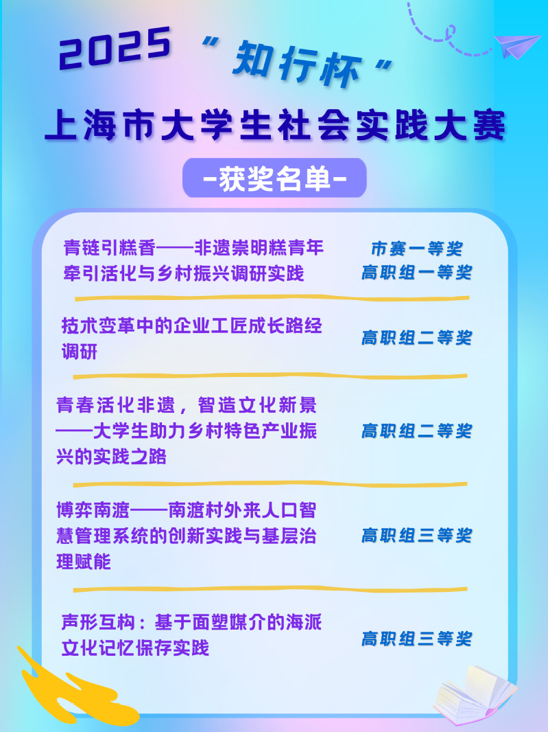 近日,由团市委等八部门联合主办的2025年知行杯上海市大学生社会实践大赛圆满落幕。作为上海高校实践育人的重要平台,该大赛聚焦乡村振兴、非遗传承、基层治理等热点议题展开项目评选。我校学子凭借扎实的专业功底和创新实践精神,在比赛中脱颖而出,共斩获高职组一等奖1项、二等奖2项、三等奖2项,其中一项项目入围市级决赛,并在与高校组同台竞技中荣获市赛决赛一等奖。