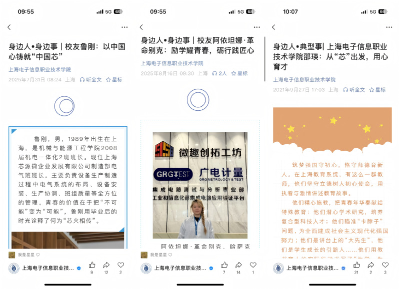打造集成电路领域典型人物矩阵。依托融媒体平台打造“优秀师生—杰出校友”典型人物矩阵。如上海市为人为学为师典型邵瑛带领团队聚焦“卡脖子”领域,建设集成电路专业群。上海市首席技师校友李雪珺,十年如一日精研航天精密装配技术。通过社会融媒、官微官网等多平台全方位宣传,形成“榜样示范—价值引领—信心增强”育人闭环。