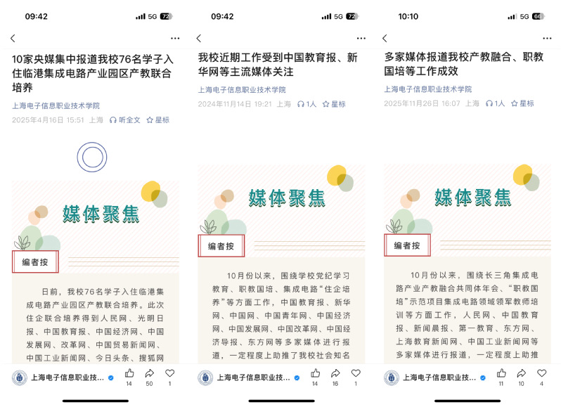 “强根”:深化产教融合的宣传叙事。校企合作模式深度解码传播。通过公众号、视频号、行业媒体等系统解读“住企联合培养”等创新模式,呈现企业导师进课堂、学生住企实习的生动育人实践。在“长三角职教产科教联盟大会”“上海集成电路人才培养联盟成立”等行业重大事件中主动发声,强化学校人才培养话语权。